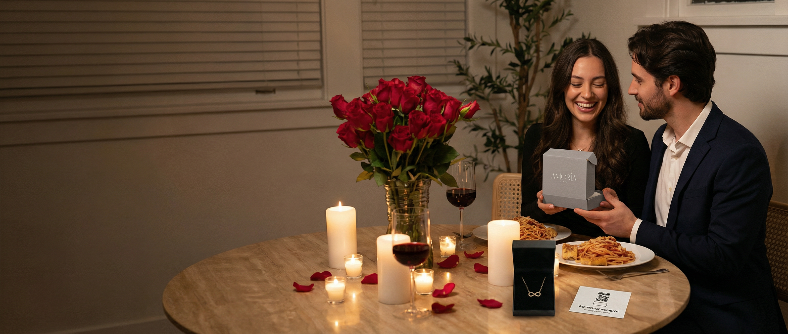 Le moment arrive. Elle ouvre l’écrin, découvre le bijou… puis ce petit QR code intrigant. Un scan. Et soudain, votre message apparaît.